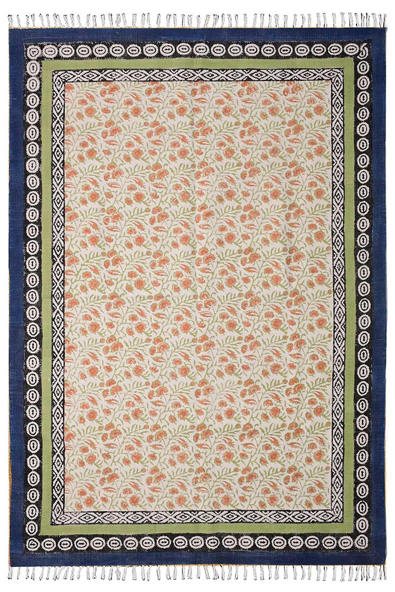 Hand Block Printed Floral Rug with Multi-Border Design